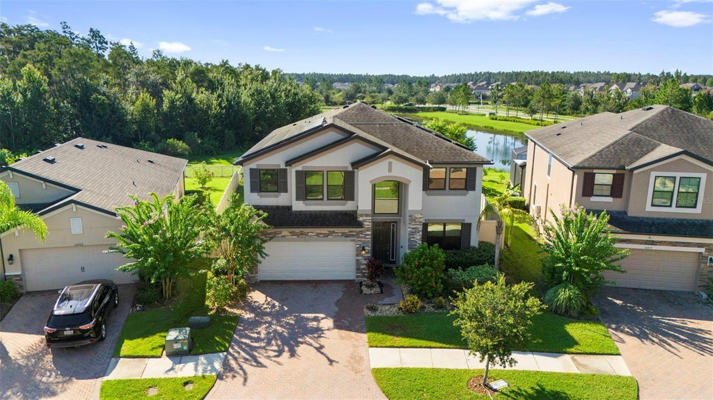Stunning Lakefront Retreat! SELLER MOTIVATED!! This beautifully upgraded 5-bedroom, 3-bathroom lakefront home offers a striking high elevation for standout curb appeal. The main entrance opens to a spacious foyer and flex room, perfect for a home office, formal sitting area, or playroom. The open-concept layout leads into the open kitchen with Quartz countertops, stainless steel appliances, a large island, and ample cabinetry—flowing into the living and dining areas. A private main-floor guest bedroom with full bath and a pool door offers flexibility for visitors or multi-generational living. Upstairs features a luxurious master suite with custom-designed walk-in closets, plus three additional bedrooms with a shared bath. A highlight of the upper level is the oversized game/media room—ideal for family fun or entertaining. Enjoy Florida outdoor living in your screened-in (caged), fenced backyard with a fully equipped outdoor kitchen and peaceful lake views. Additional Features: 11.6KW Energy efficient Solar panels-Fully paid(29K) Custom closets in primary and one of the additional bedrooms High elevation with great curb appeal Dedicated laundry room & 3 car Tandem garage. Featured with underground Buried Propane tank (120 Gallon) under annual lease(96$). Located near top-rated schools, shopping, parks, and commuter routes Don't miss this spacious, energy-efficient lakefront home with luxury upgrades and room for the whole family. This Community offers a resort-style pool, tennis courts, pickleball courts, play area, clubhouse event hall, Everything you need for a active social living.